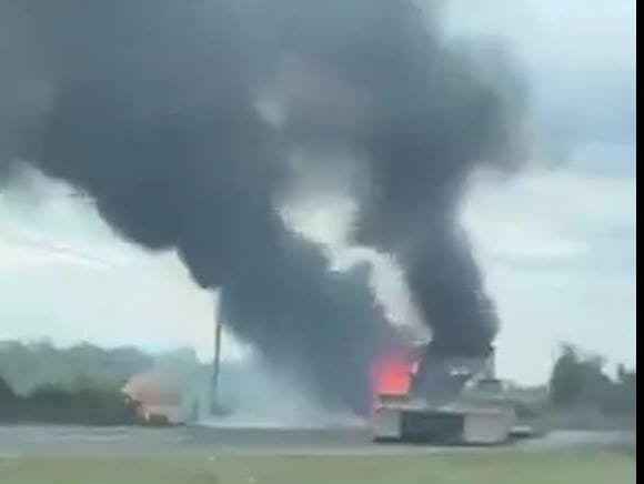 Usuarios de redes sociales publicaron video donde se observa un tráiler incendiado y otro vehículo de carga utilizados para bloquear distintos puntos de la Carretera Nacional.