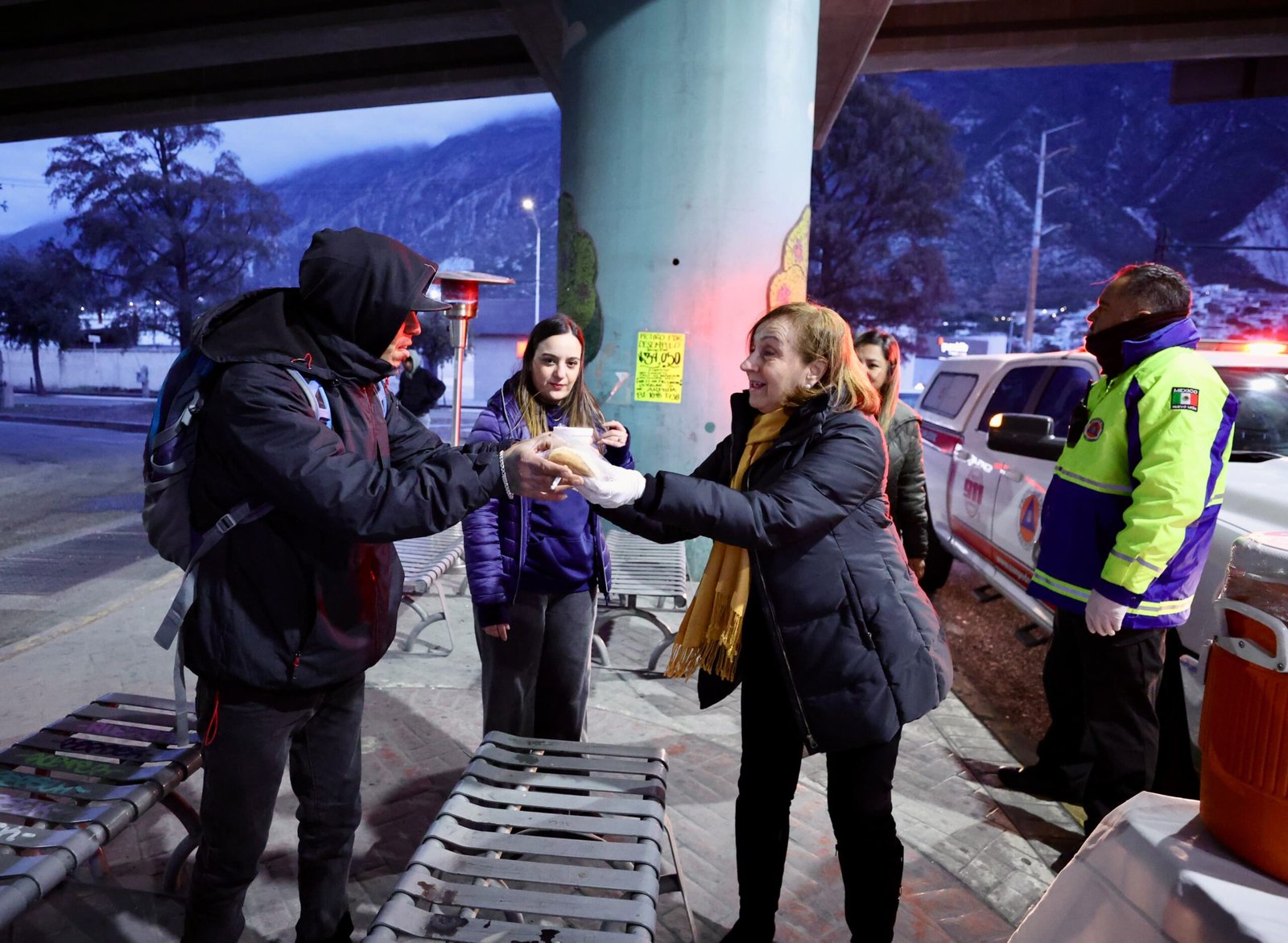 A las 5 de la mañana dio inicio el operativo del Municipio de San Pedro, con un convoy de unidades de la Secretaría de Seguridad Pública, encabezada por su titular, José Luis David Kuri, repartiendo bebidas calientes y pan a ciudadanos que esperaban su camión o personas que se encontraban en la calle por motivos de trabajo.