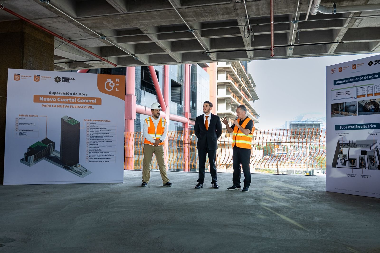 La construcción del Cuartel General para la Nueva Fuerza Civil que albergará a todas las dependencias de seguridad de Nuevo León avanza en tiempo y forma, dijo el Gobernador del Estado, Samuel Alejandro García Sepúlveda al supervisar las obras de este inmueble que se construye en la Avenida Morones Prieto.