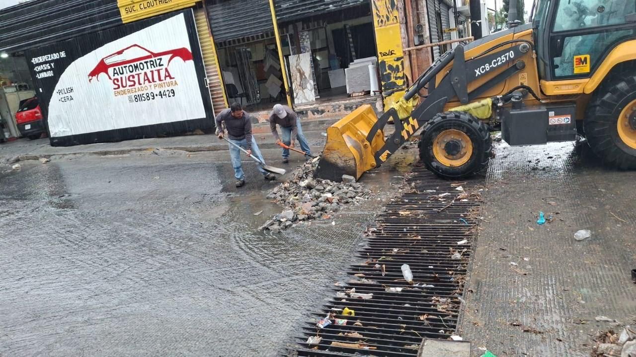 Por instrucciones del Alcalde Jesús Nava Rivera, cuadrillas de la Secretaría de Servicios Públicos apoyadas con retroexcavadora destaparon canalones y rejillas obstruidas por basura, ramas, piedras y desechos que fueron arrastrados por la corriente de agua.