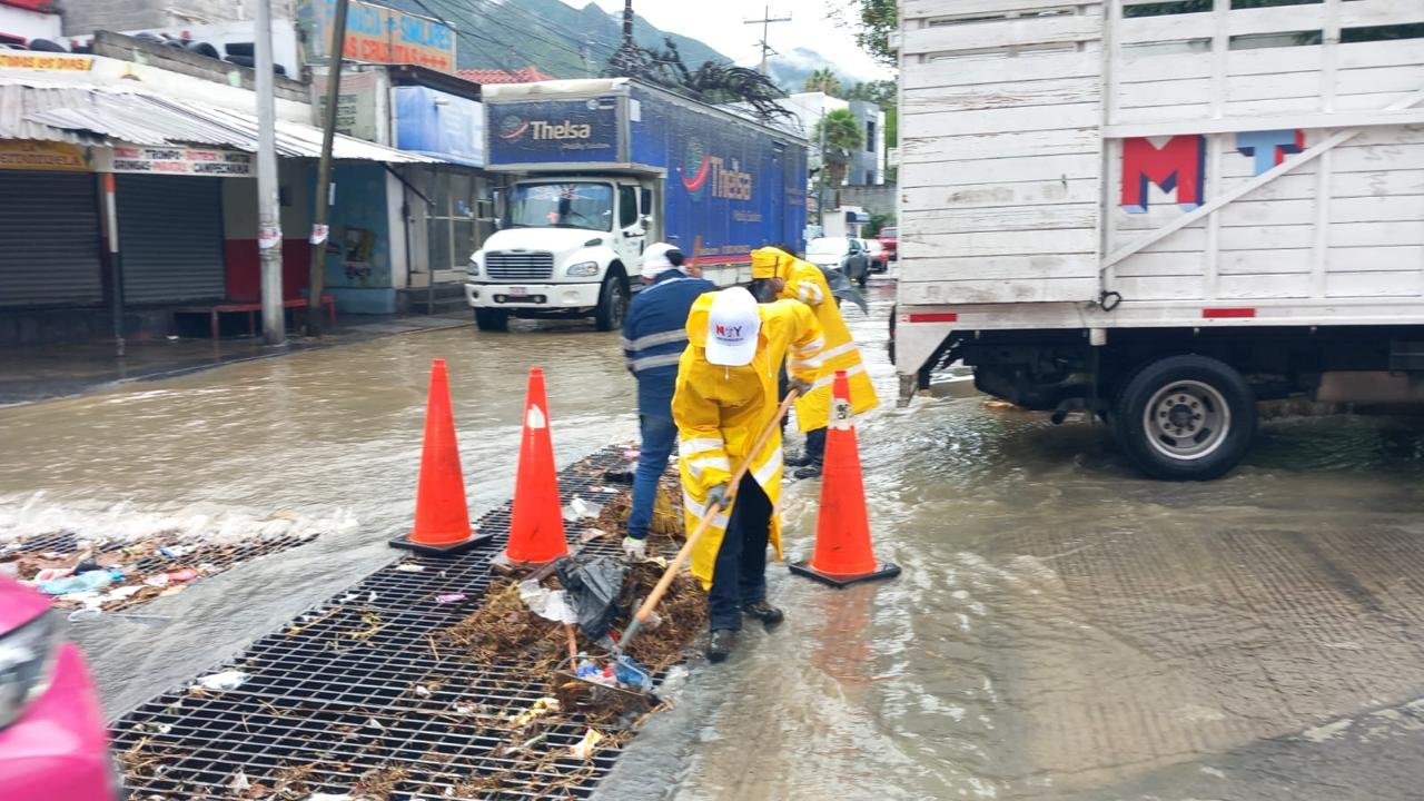 Elementos de las cinco zonas operativas de la Secretaría de Servicios Públicos de Monterrey trabajan en toda la ciudad, especialmente en las zonas más vulnerables de riesgo de inundación para el retiro de la basura que se acumula en las rejillas.