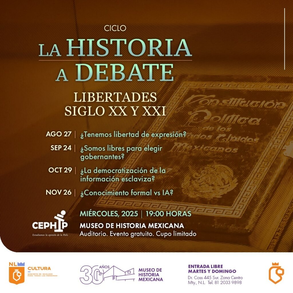 El Museo de Historia Mexicana invita al ciclo “Historia a Debate. Libertades siglos XX y XXI”, que abrirá la reflexión sobre los alcances y límites de las libertades democráticas en la vida nacional, desde la libertad de expresión y la participación ciudadana, hasta los retos que imponen las nuevas tecnologías de la información y la inteligencia artificial.