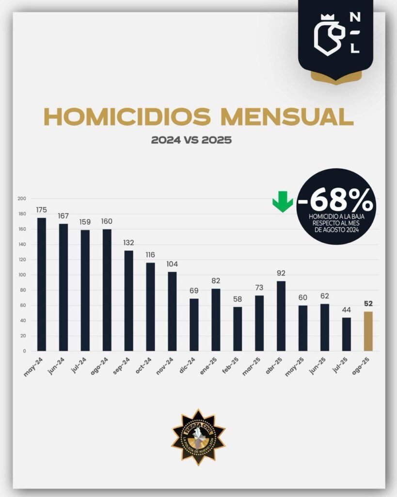 Según el conteo oficial, en lo que va de agosto de 2025 se han registrado 52 casos de homicidio doloso, contra los 160 registrados en el mismo mes del año pasado.