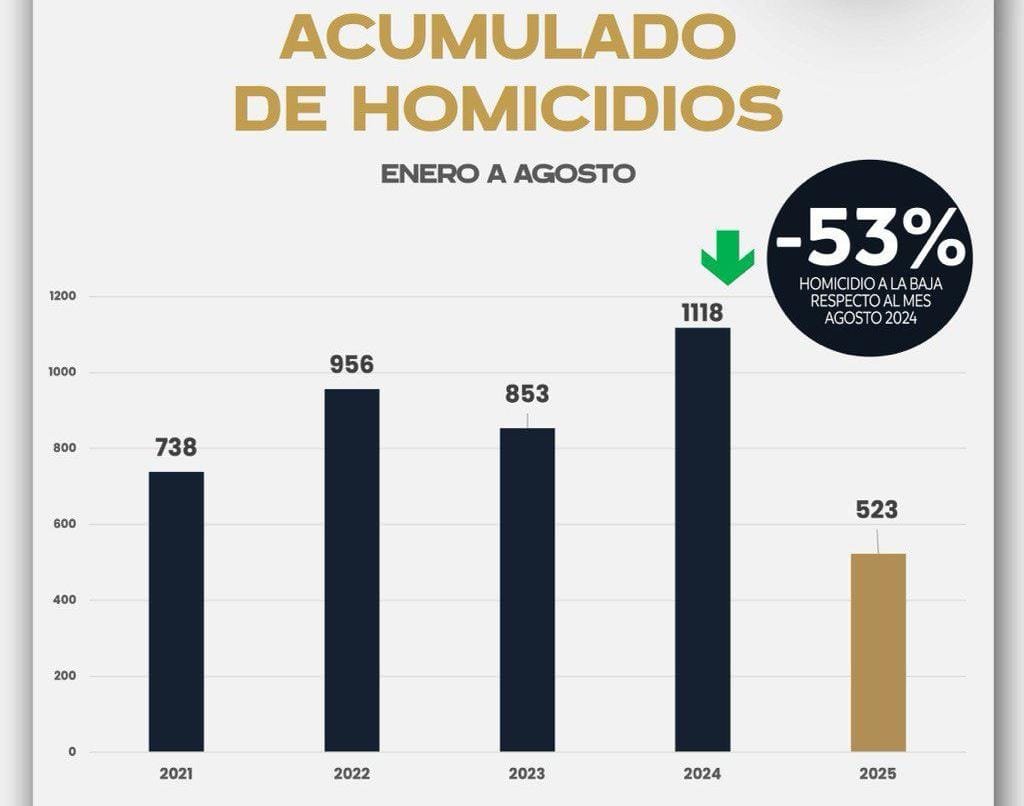 Al corte del 30 de agosto, el año 2025 ha registrado un acumulado de 523 homicidios, frente a los 1118 acumulados en el mismo periodo de 2024, lo que implica una reducción del 53%.
