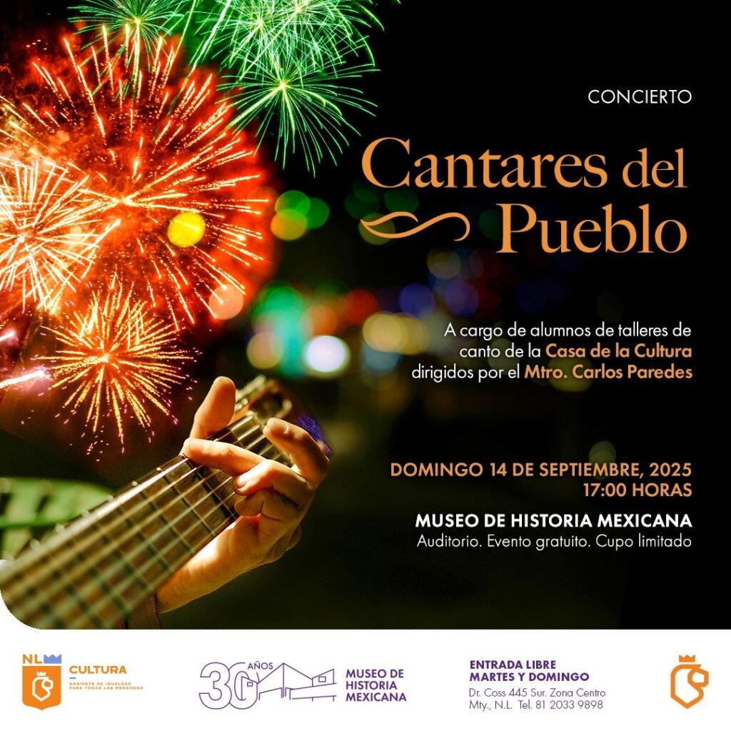 En los días de celebración nacionalista, el domingo 14 de septiembre a las 17:00 horas en el auditorio del Museo de Historia Mexicana se presentará Cantares del Pueblo con música nacionalista y popular. Cabe señalar que el Museo de Historia Mexicana, el Museo del Noreste y el Museo del Palacio, tendrán un horario especial el martes 16 de septiembre: abrirán sus puertas a las 12:00 horas y concluirán sus actividades a las 20:00 horas.