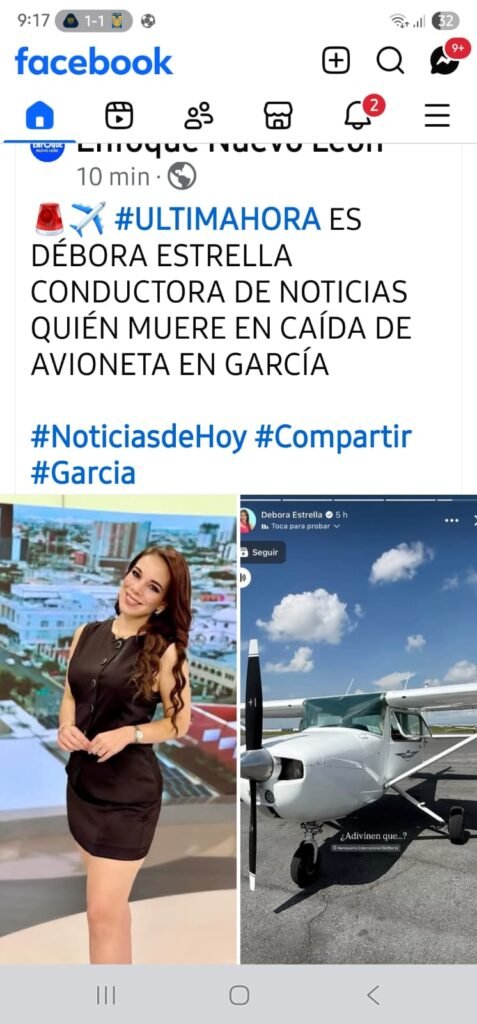Dos personas, entre ellas Débora Estrella, conductora de noticias en Multimedios Televisión en Monterrey, y el piloto fallecieron al caer la avioneta en la que viajaban en el municipio de García, en Nuevo León.