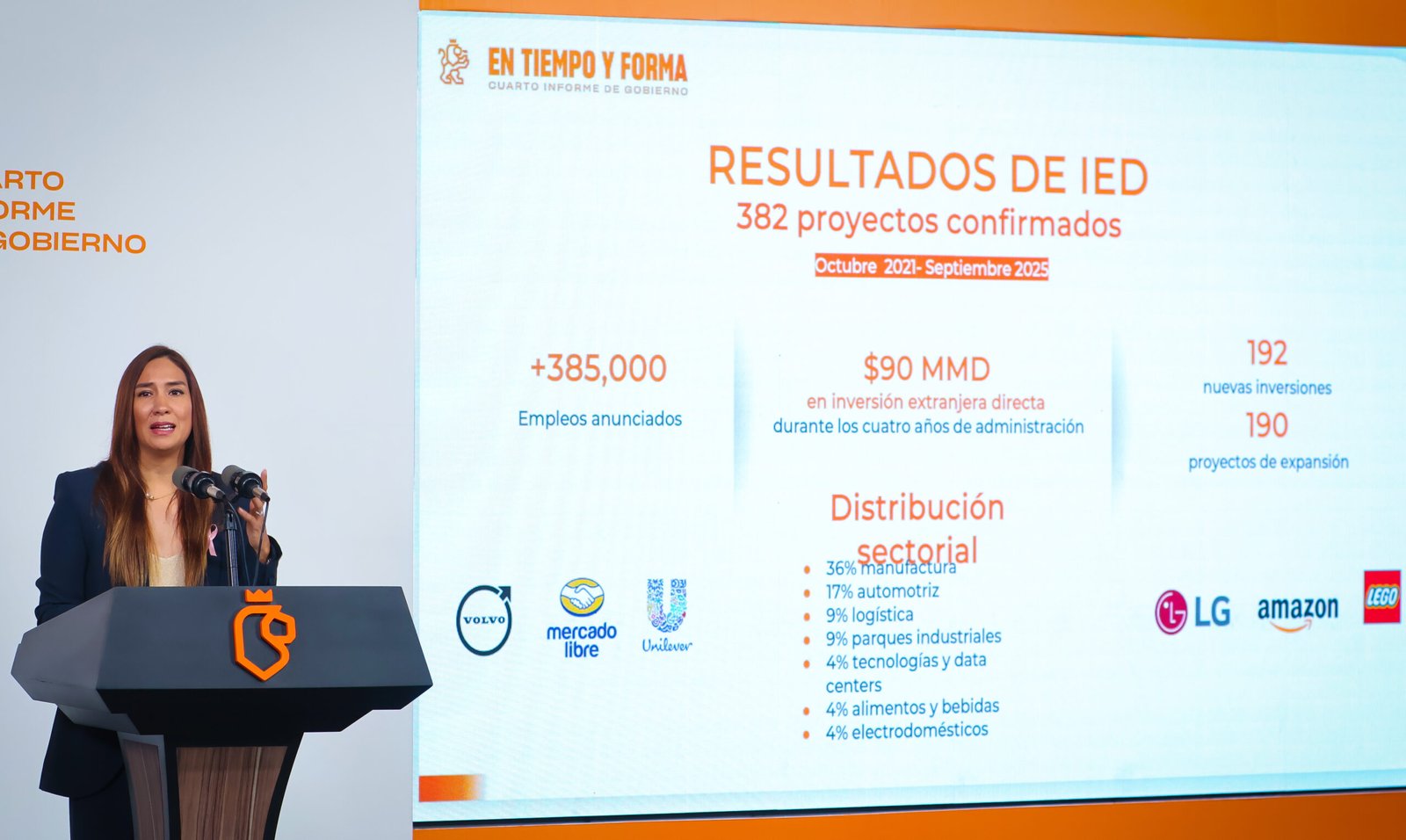 La Secretaria informó que el estado ha alcanzado más de 90 mil millones de dólares en inversión extranjera, con 396 proyectos confirmados, de los cuales la mitad son nuevas inversiones y la otra mitad expansiones de empresas que siguen apostando por la entidad gracias a su talento, infraestructura y paz laboral de más de 27 años ininterrumpidos.