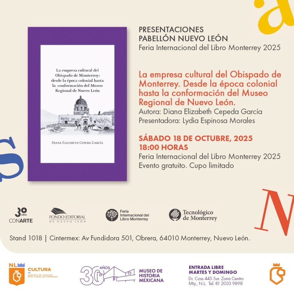 El Museo de Historia Mexicana, en coordinación con la Secretaría de Cultura y el Fondo Editorial de Nuevo León, presenta el libro “La empresa cultural del Obispado de Monterrey. NoDesde la época colonial hasta la conformación del Museo Regional de Nuevo León”, de la historiadora Diana Elizabeth Cepeda García, el sábado 18 de octubre a las 18:00 horas en la Feria Internacional del Libro Monterrey 2025.
