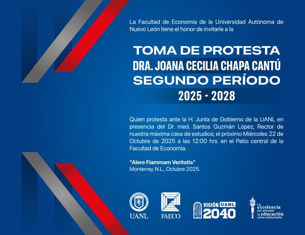 La doctora Joana Cecila Chapa Cantú, tomará protesta para su segundo período 2025-2028 al frente de la dirección de la Facultad de Economía de la Universidad Autónoma de Nuevo León.