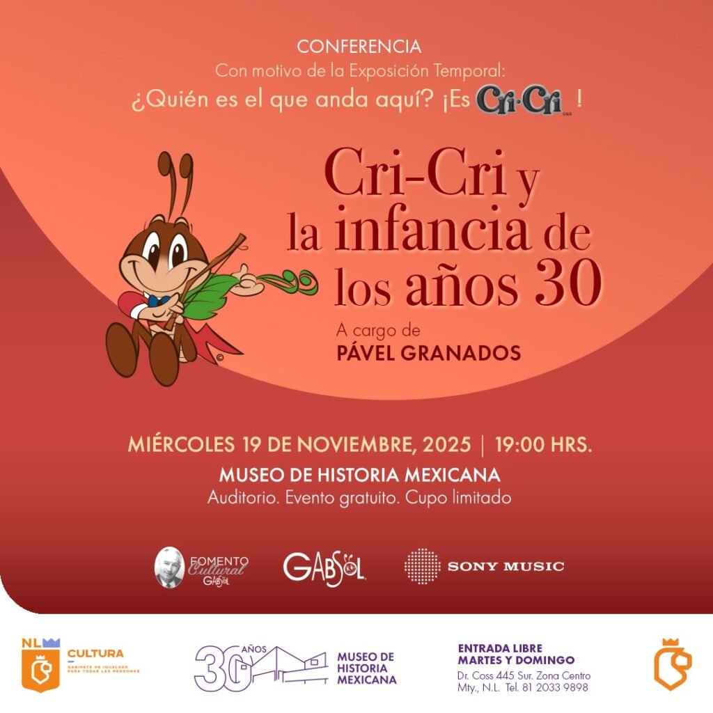 La charla se realizará el miércoles 19 de noviembre a las 19:00 horas en el auditorio del Museo de Historia Mexicana, en el marco de la exposición “¿Quién es el que anda aquí? ¡Es Cri-Cri!”, que se exhibe en el Museo del Noreste.