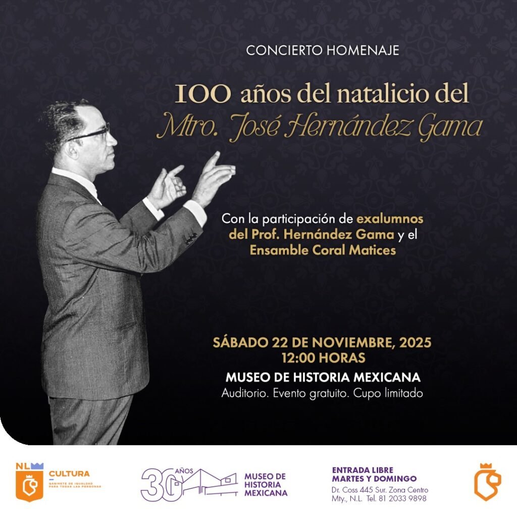 El Museo de Historia Mexicana y la Universidad de Monterrey, a través de su Departamento de Humanidades, invitan al homenaje “100 años del natalicio del Mtro. José Hernández Gama” el sábado 22 de noviembre a las 12:00 horas, el auditorio de este museo.