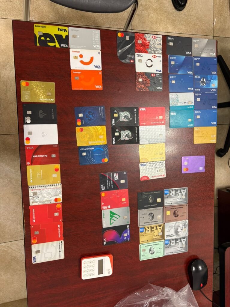 Durante la revisión preventiva, los policías localizaron entre sus pertenencias más de 50 tarjetas bancarias de distintas instituciones, así como un dispositivo tipo terminal, objetos que fueron asegurados como indicios para su puesta a disposición ante la autoridad correspondiente.