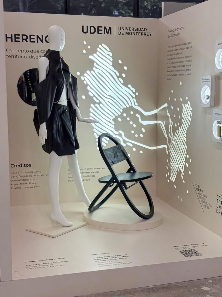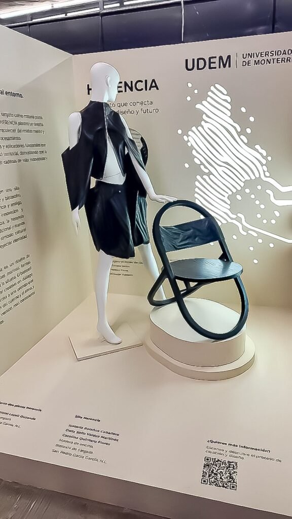 En este marco, el equipo de estudiantes de la Universidad de Monterrey recibió el primer lugar por su propuesta, que incluye un vestido y una silla plegable elaborados con el biomaterial, asegurando además su exposición en el prestigioso Espacio CDMX.