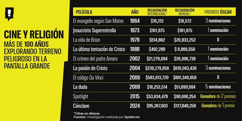 De acuerdo con lo arrojado en el conteo de Spoiler.mx, El Código Da Vinci y La Pasión de Cristo son los filmes religiosos con mayor taquilla a nivel mundial, probando que la audiencia está constantemente atraída por conocer, por un lado, nuevas perspectivas y misterios alrededor de la historia de Jesús, pero por el otro, también busca versiones más fidedignas, sin importar qué tan crudas sean.