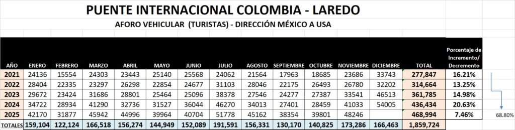 El registro del INM indica que; de Enero a Septiembre de 2025, los Permisos Personales de Internamiento otorgados a Paisanos y Turistas que cruzan de Estados Unidos por Puerto Colombia – Laredo, ascienden a 69,603, esto es: 121.24 por ciento superior a los 51,500 Permisos de todo el 2024.