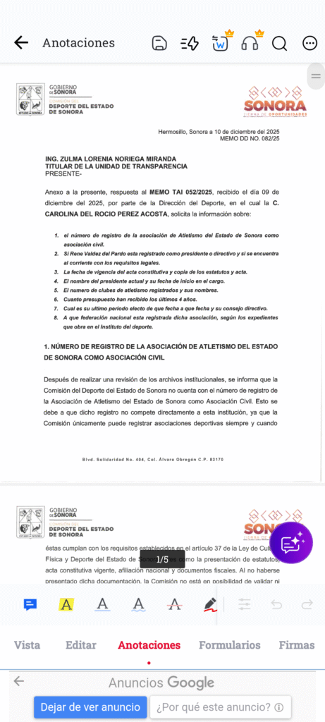 En respuesta al Memorandum TAI 052/2025, recibido por la Unidad de Transparencia del Estado de Sonora, sobre datos solicitados de la Asociación de Atletismo del Estado presidida por René Valdez del Pardo la respuesta fue: