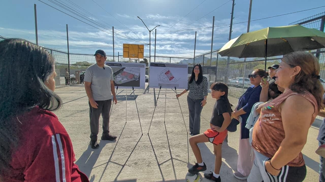 Nava Rivera informó a los vecinos sobre los trabajos en dicho espacio público que consisten en la construcción de una cancha polivalente, andadores de concreto, instalación de alumbrado público, bancas metálicas y áreas permeables.