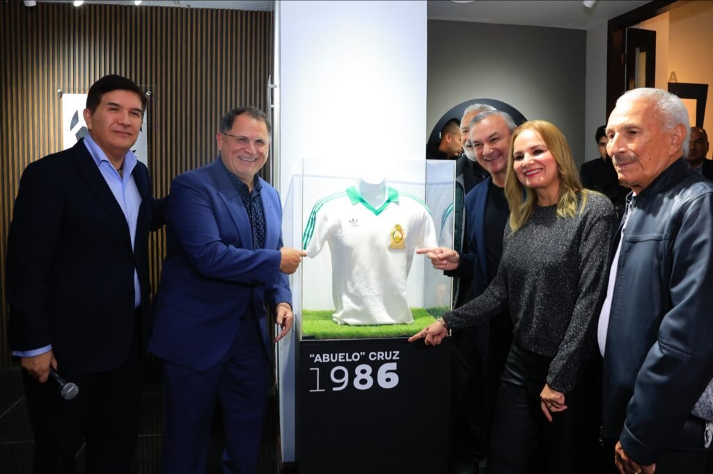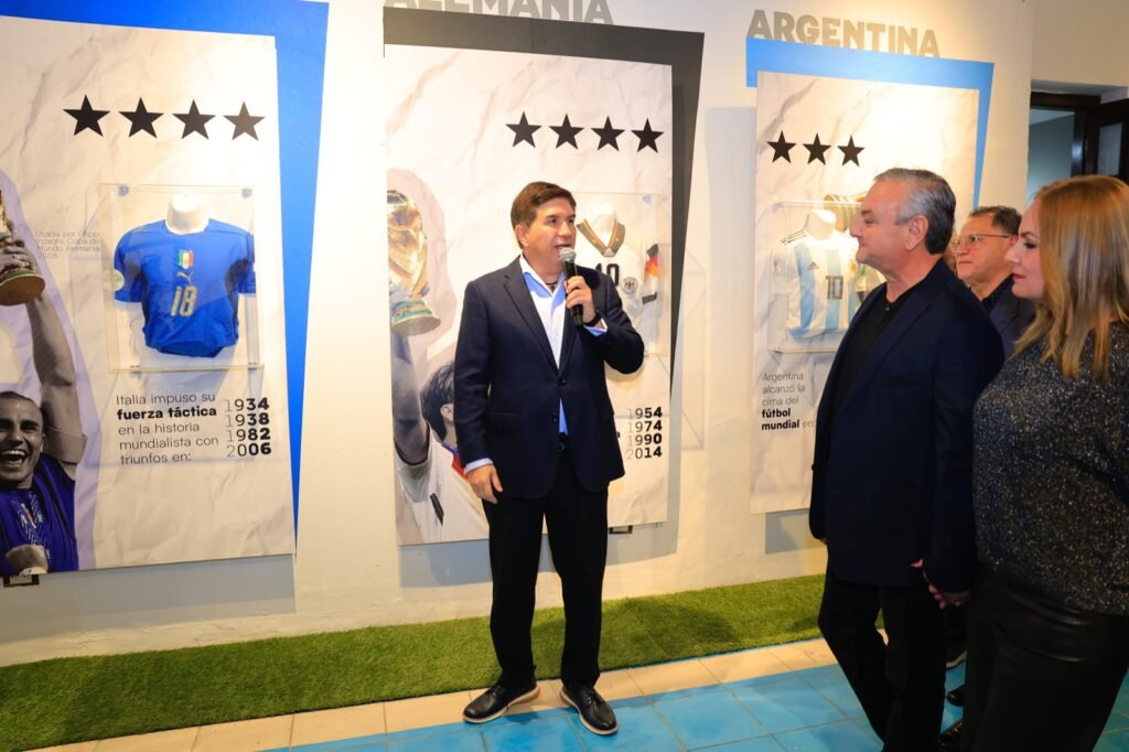 El alcalde Héctor García junto a Gabriel Bustamante, Fundador y Director del Museo Épica, facilitador de las piezas, cortaron el listón inaugural de la Exposición, que invita a las y los guadalupenses a considerarse parte activa del capítulo histórico de la Copa FIFA 2026 y que tendrá como sede el Estadio BBVA.