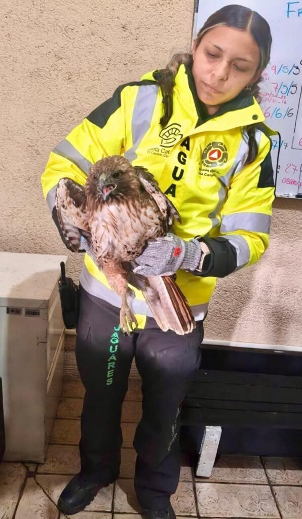 Elementos de Protección Civil de Santa Catarina rescataron un ejemplar de águila cola roja adulta que presentaba lesiones, luego de recibir el reporte en la colonia Parque Industrial Milenium.