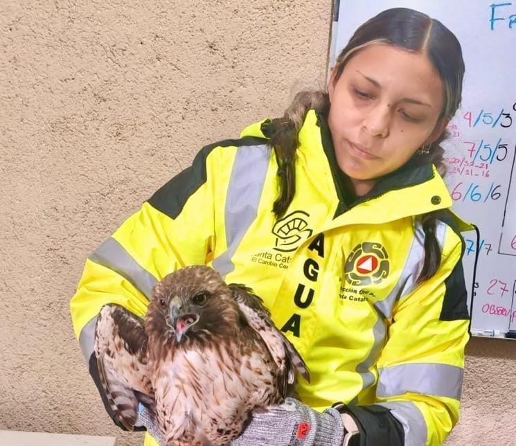 Elementos de Protección Civil de Santa Catarina rescataron un ejemplar de águila cola roja adulta que presentaba lesiones, luego de recibir el reporte en la colonia Parque Industrial Milenium.