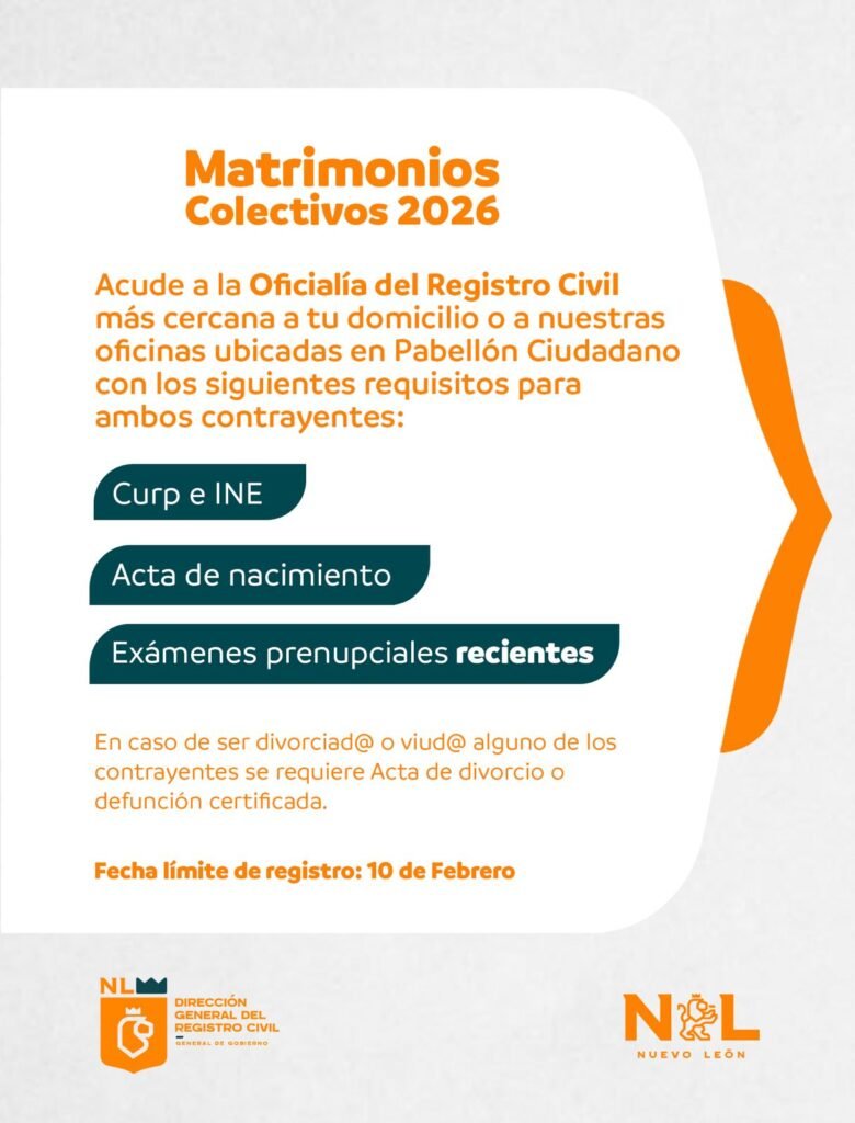 Para celebrar el amor, el Gobierno de Nuevo León a través de la Secretaría General de Gobierno que encabeza Miguel Flores Serna, realizará una edición más de matrimonios colectivos el próximo 14 de febrero de 2026.