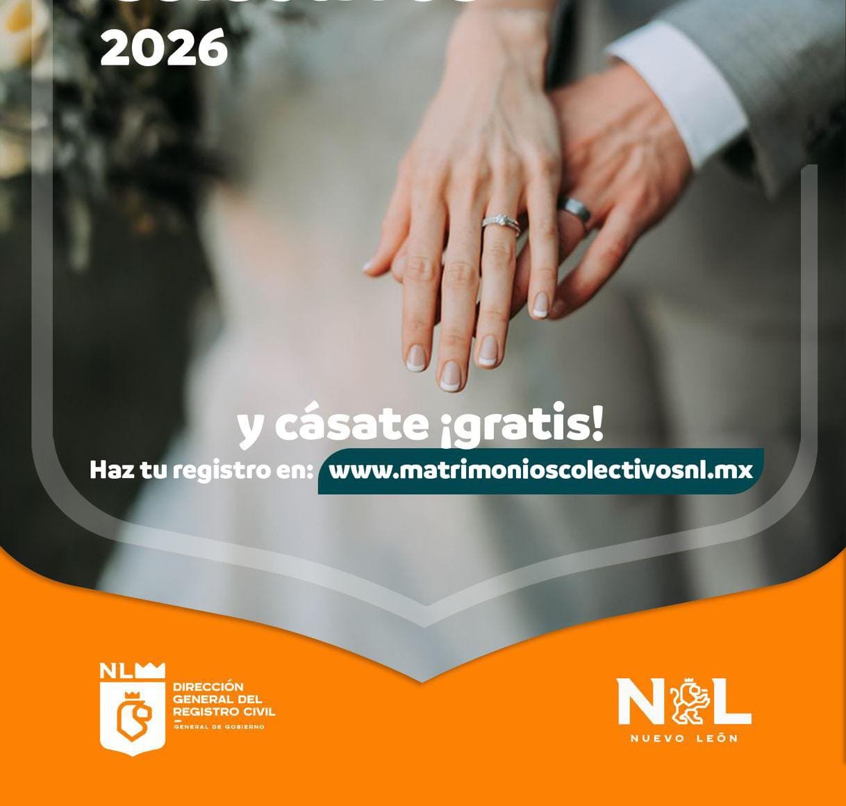 En coordinación con la Dirección de Registro Civil, el Estado invita a las parejas a sellar su unión de manera legal en forma gratuita al evento que se llevará a cabo en el Gimnasio Nuevo León Unido que se ubica en la Avenida Manuel L. Barragán en la colonia Regina en Monterrey.