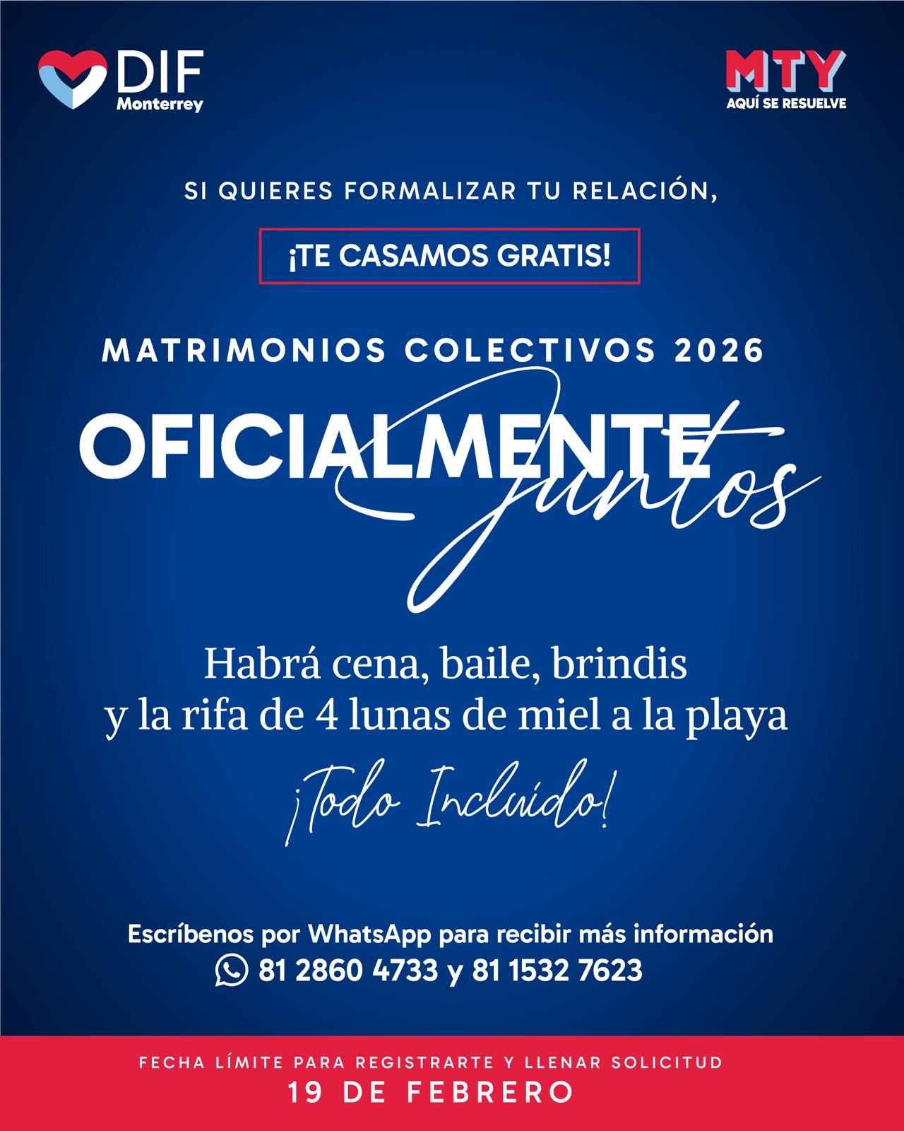 Para mayor información, enviar mensaje por WhatsApp a los teléfonos 81 2860 4733 y 81 5132 7623 o deberán acudir a las Oficinas Generales del DIF Monterrey ubicadas en Loma Redonda número 1500, colonia Loma Larga