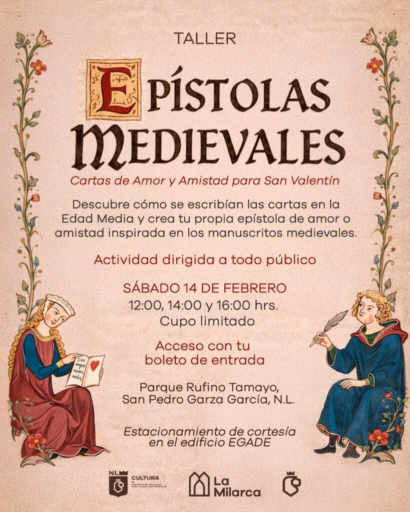 Todos los materiales serán proporcionados durante el taller, incluyendo hojas con diseños de inspirados en los arcos medievales que posee el Museo La Milarca, bolígrafos, lápices, colores y diversos artículos decorativos.Los visitantes al museo podrán participar en el taller “Epístolas Medievales. Cartas de Amor y Amistad para San Valentín” sin costo adicional. El cupo es limitado, por lo que se recomienda llegar con anticipación.