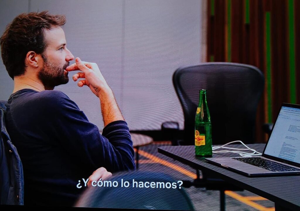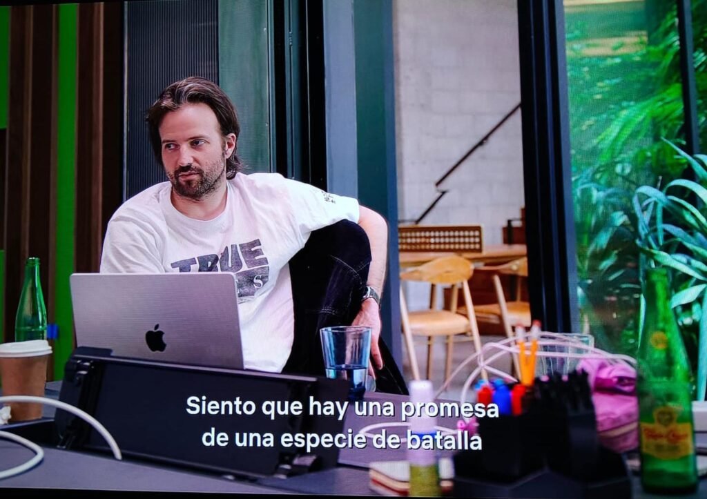 Uno de los hermanos cierra la puerta de una sala de juntas sosteniendo una botella y durante un reunión decisiva con los creativos de la serie a partir del minuto 43:48.