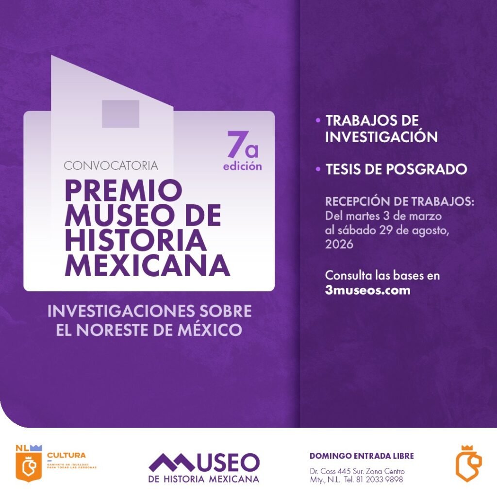 El Museo de Historia Mexicana y el Patronato de los 3 Museos de Historia convocan al “Premio Museo de Historia Mexicana: Investigaciones sobre el Noreste de México” en su Séptima Edición 2026, un certamen que se ha consolidado vital para el impulso y reconocimiento de la investigación histórica sobre el noreste mexicano, fortaleciendo el estudio y la difusión del pasado regional, la fecha límite para la recepción de trabajos es el 29 de agosto de 2026.
