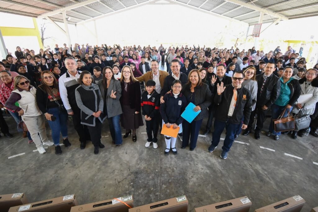 Alumnos, padres de familia y personal docente de los planteles beneficiarios se dieron cita en la escuela primaria Derechos del Niño Neolonés, ubicada en la colonia san Bernabé para recibir paquetes de computadoras con acceso a la red satelital Starlink.