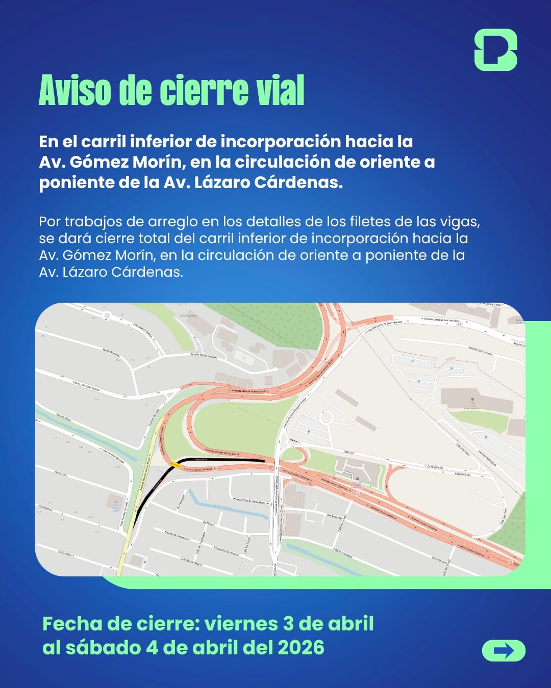 El Municipio de San Pedro Garza García informa que durante dos días implementará el cierre total del carril inferior de incorporación de la Avenida Lázaro Cárdenas hacia la Avenida Gómez Morín, debido a trabajos de soldadura en soportes para el refuerzo de un barandal.