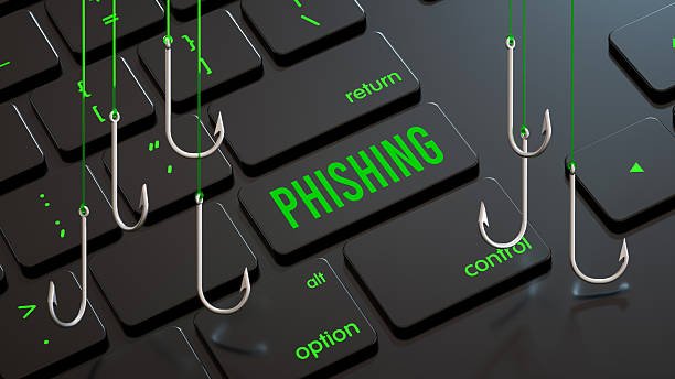 This Modern 3D Render highlights the Danger of Phishing attacks in the digital realm. A Computer Keyboard features a prominent key with “PHISHING” in Green Color Text, with multiple silver Hook – Equipment items dangling above, symbolizing deceptive lures. The Concept serves as a Warning Sign for Internet users about Computer Crime, Fraud, Data Breach, and Identity Theft. It underscores the Risk and Vulnerability to Threats like Spyware, Spoofing Attack, and Computer Virus installations by a Computer Hacker. This visual emphasizes the need for Network Security, Protection, Alertness, and a cautious Strategy when Typing or interacting Online to avoid being Trapped by such Exploitation.