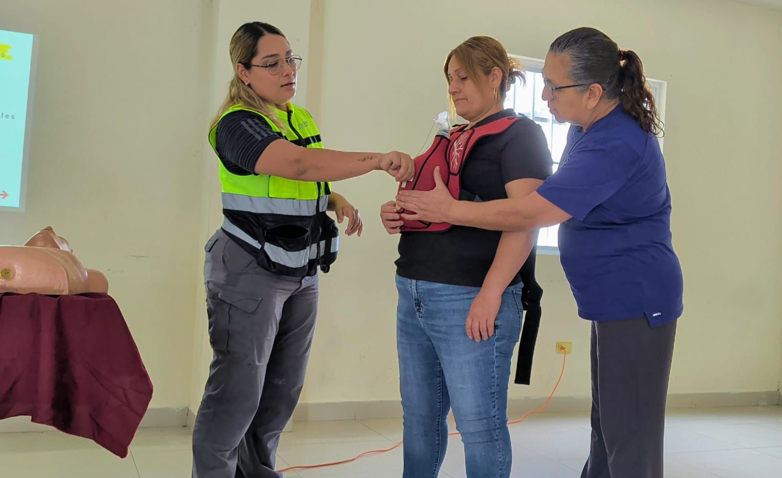 También se imparten conocimientos sobre reanimación cardiopulmonar (RCP) básica, enseñando a las participantes cómo actuar ante una pérdida de conciencia mientras llega el apoyo médico.