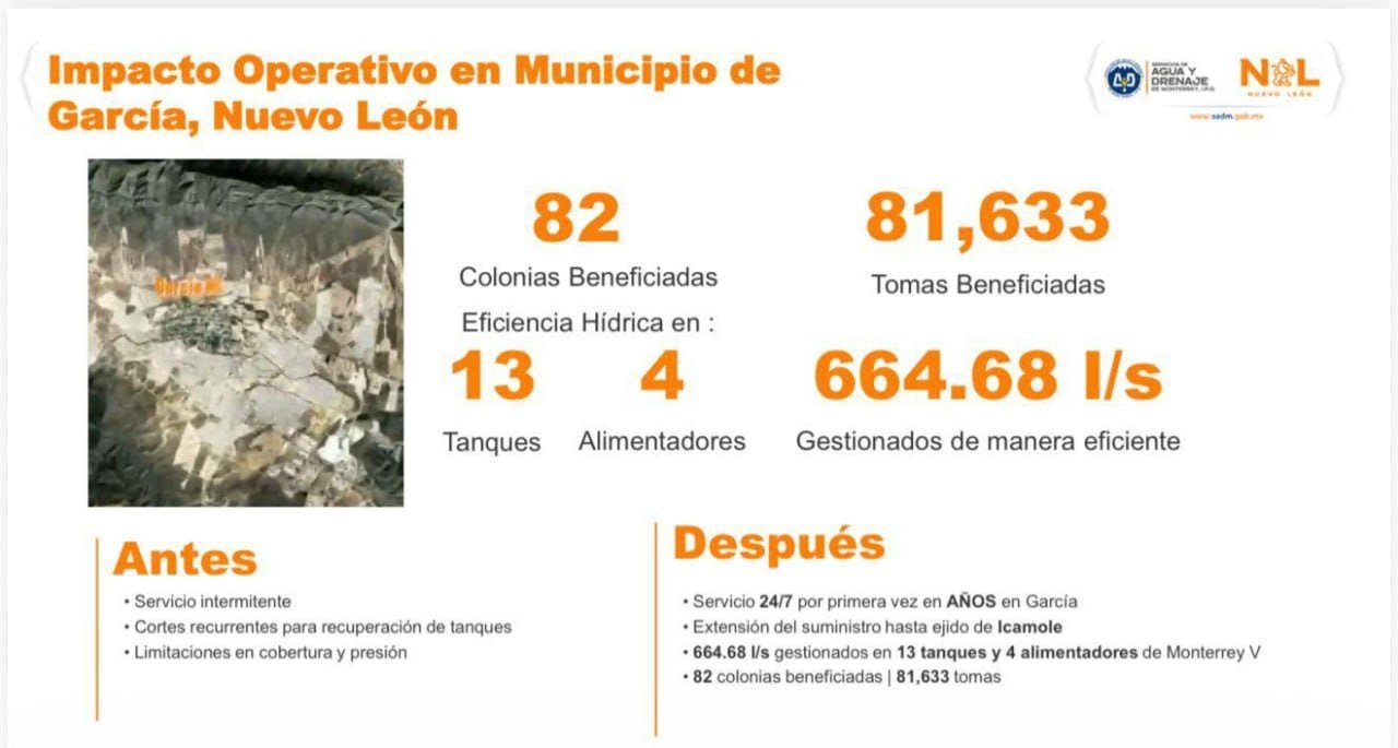 “Lo alcanzado en García es resultado de enfrentar un problema histórico, con trabajo técnico, operación estratégica y seguimiento permanente en campo. Hoy podemos decir que donde antes había intermitencia, baja presión e incertidumbre, ahora hay un servicio mucho más estable para miles de familias”, explicó.
